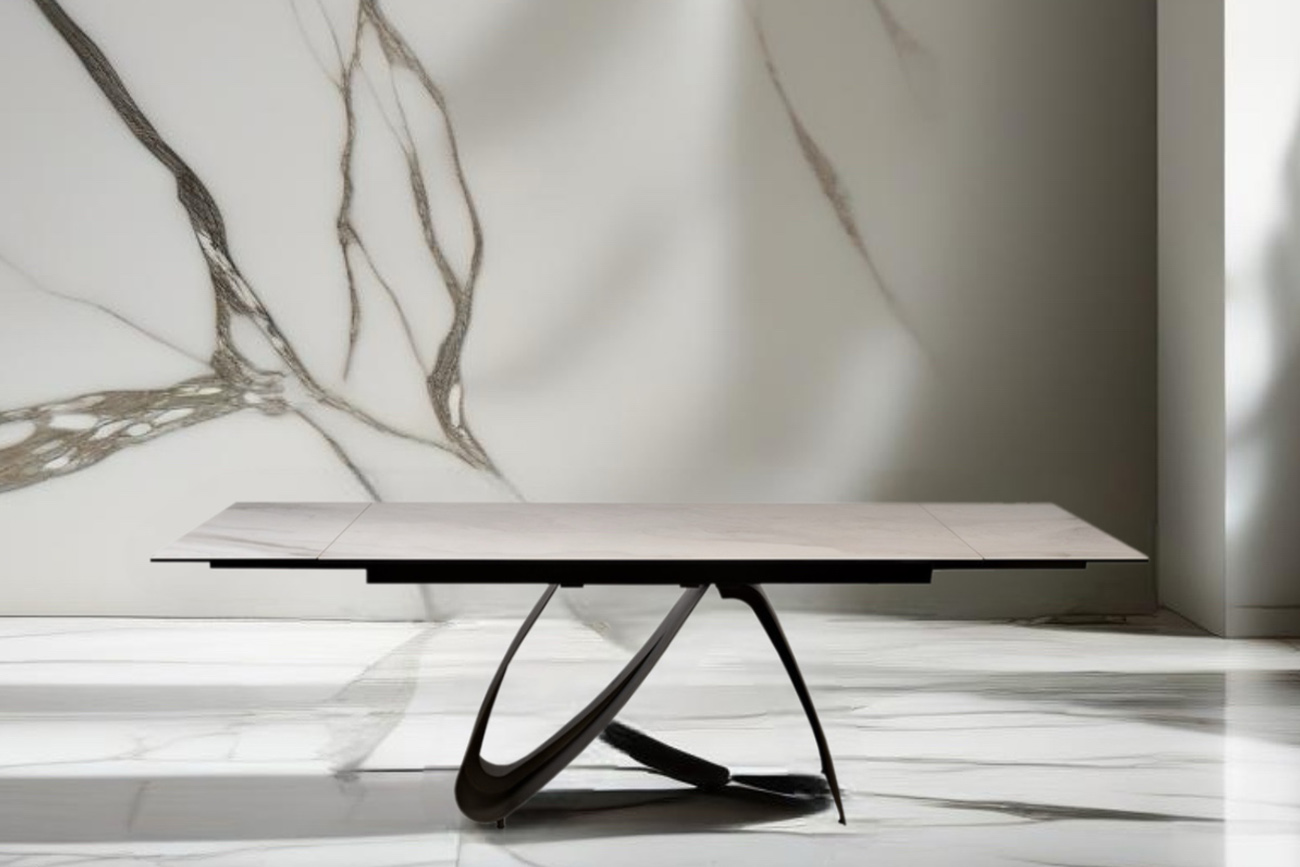 Изысканный раскладной обеденный стол с керамической столешницей – шедевр мебельного искусства, который станет центральным элементом вашей столовой. Сочетание натуральной красоты керамики и необычной формы металлических ножек придает столу неповторимый шар...
