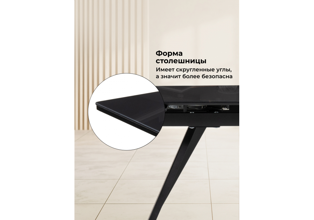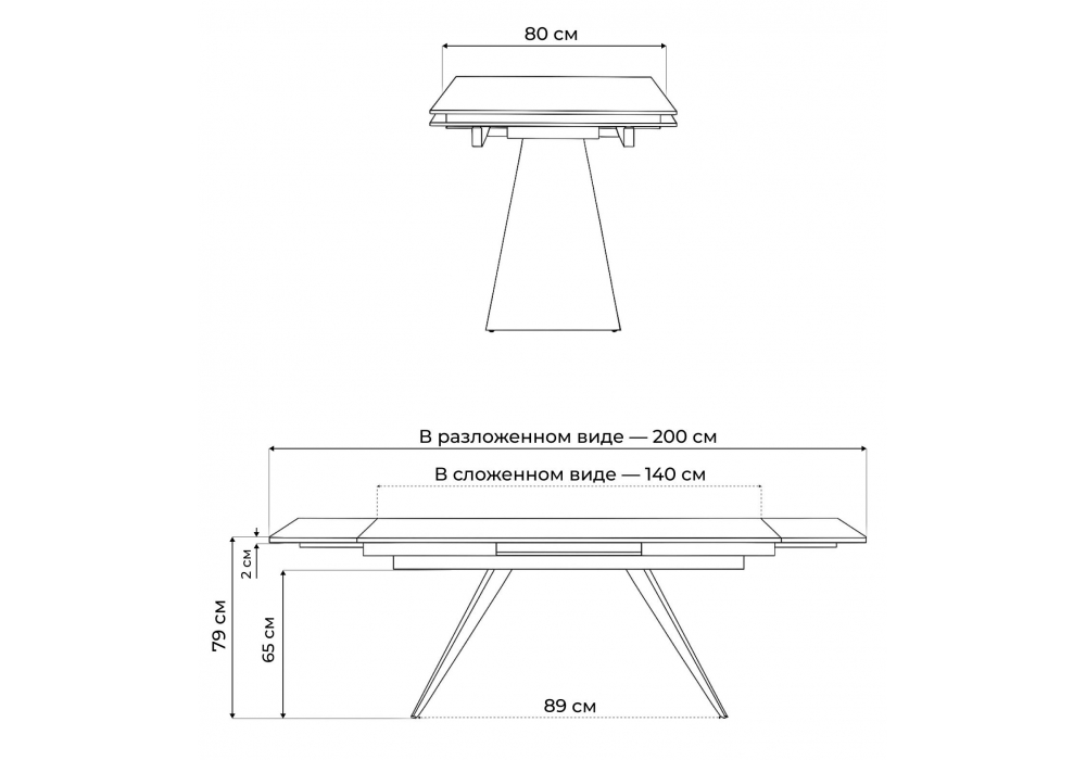 Толщина столешницы: 2 см. Материал каркаса - металл; Материал столешницы - Стекло; Цвет ножек - черный; Ширина - 80; Высота - 79; Длина стола в разложенном виде - 200; Длина - 140;