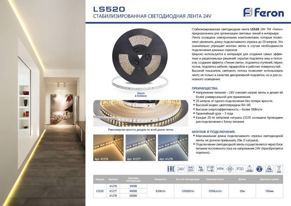 Купить "Светодиодная лента Feron 9,6W/m 120LED/m 2835SMD холодный белый 20M LS520 41278"