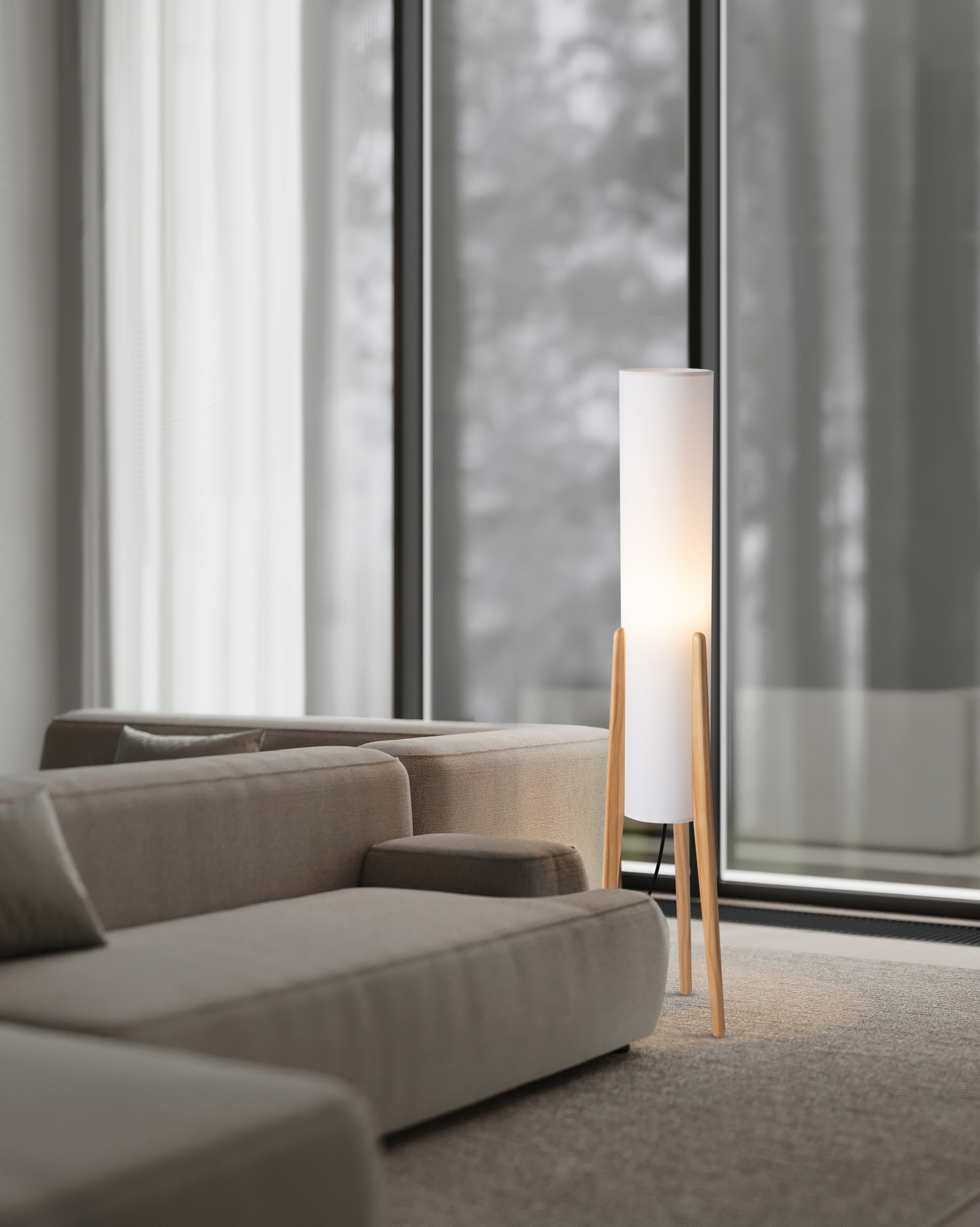Материал основания — натуральное дерево. Напольный торшер с цоколем E27. Белый тканевый абажур имеет съемную конструкцию для удобной чистки. Сочетание натурального дерева и ткани делает светильник подходящим для создания эко-интерьера.