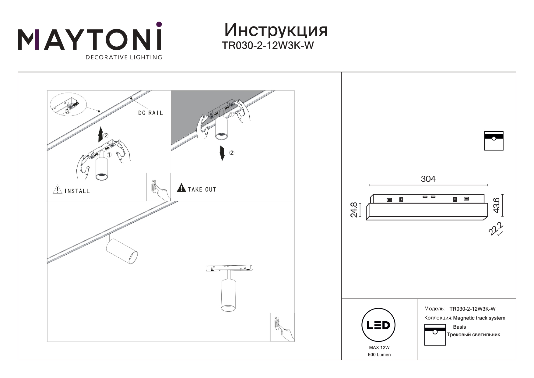 Трековый магнитный светодиодный светильник Maytoni Basis TR030-2-12W3K-W в Подольске