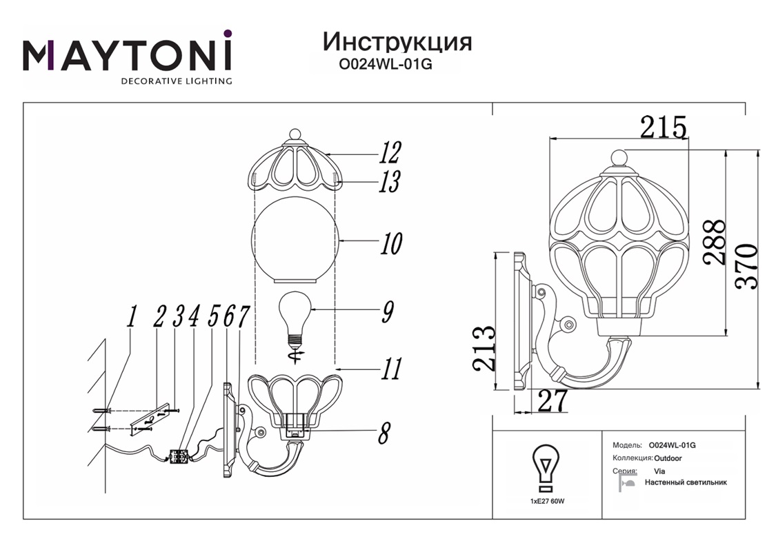 Купить "Уличный настенный светильник Maytoni Via O024WL-01G"