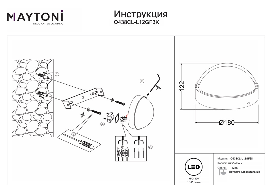 Уличный светодиодный светильник Maytoni Mon O438CL-L12GF3K — это надёжный и долговечный осветительный прибор, который прослужит вам долгие годы, не теряя своей яркости и качества света. Заказывайте O438CL-L12GF3K по лучшей стоимости с быстрой доставкой. Производитель Maytoni дает гарантию на свои товары . Данную модель O438CL-L12GF3K спешите купить в интернет-магазине 220svet.
